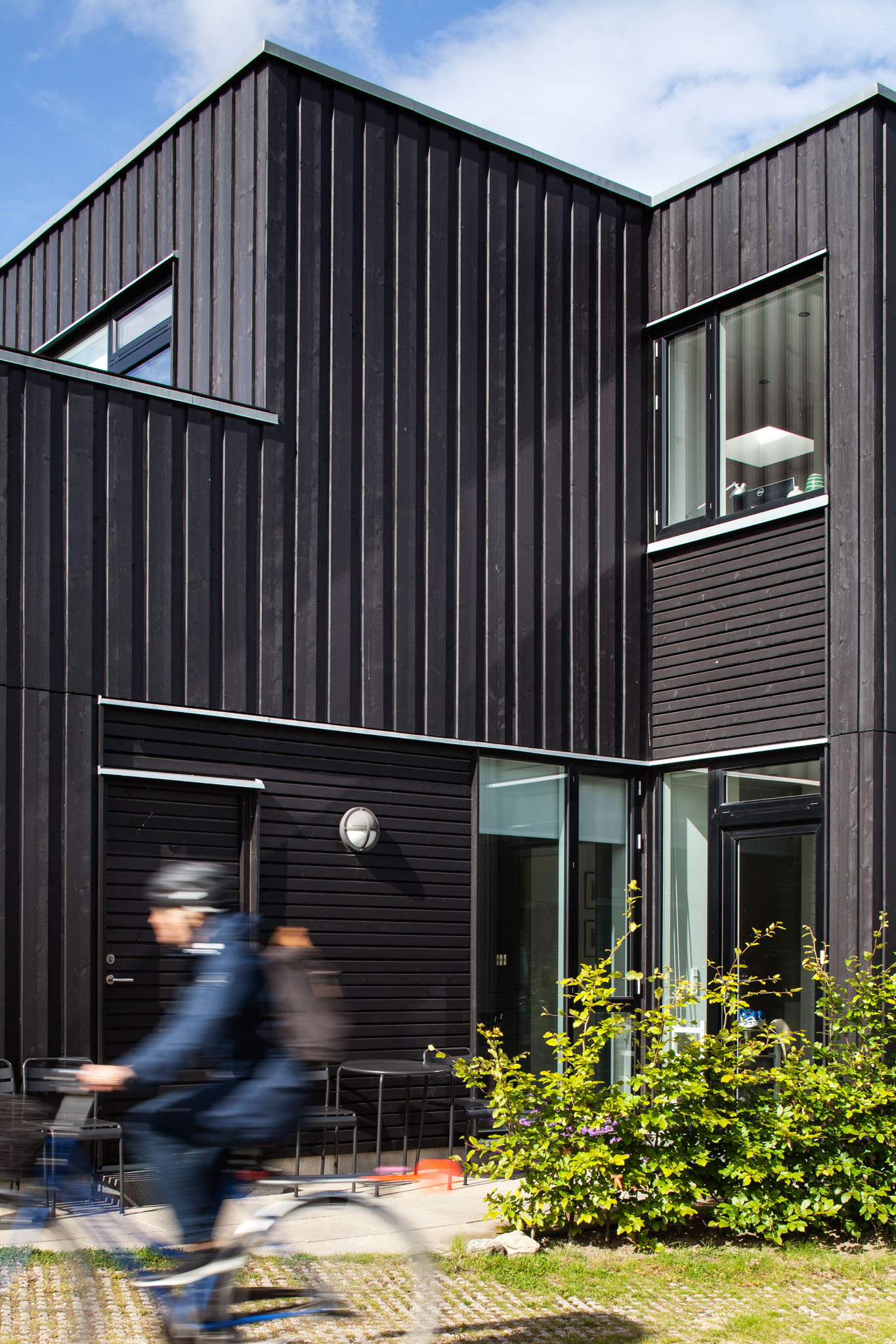 Dobbelthusene er alle opført i to etager med fladt tag. Facaderne er træbeklædte og sortmalede, de brydes kun af store vinduespartier, hvilket skaber en sammenhæng i materialer og udtryk. Boligerne er opført med små variation efter købers ønske, de fleste boliger er med altan, nogle har carport, skure og alternative indgangssituationer.